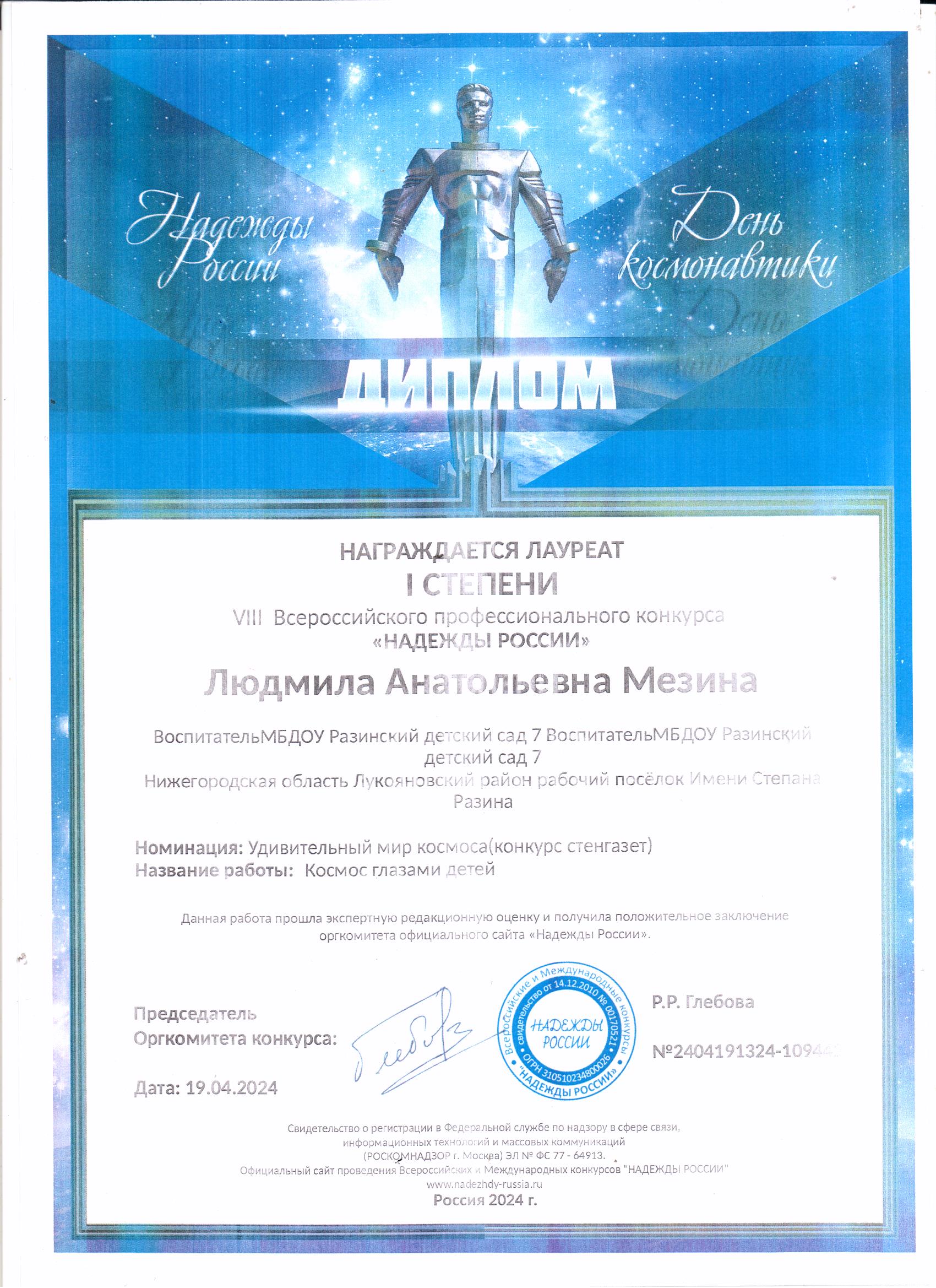Диплом 1 степени 8 Всероссийского профессионального конкурса "Надежды россии" Номинация: Удивительный мир космоса (конкурс стенгазет) Название работы:"Космос глазамидетей"