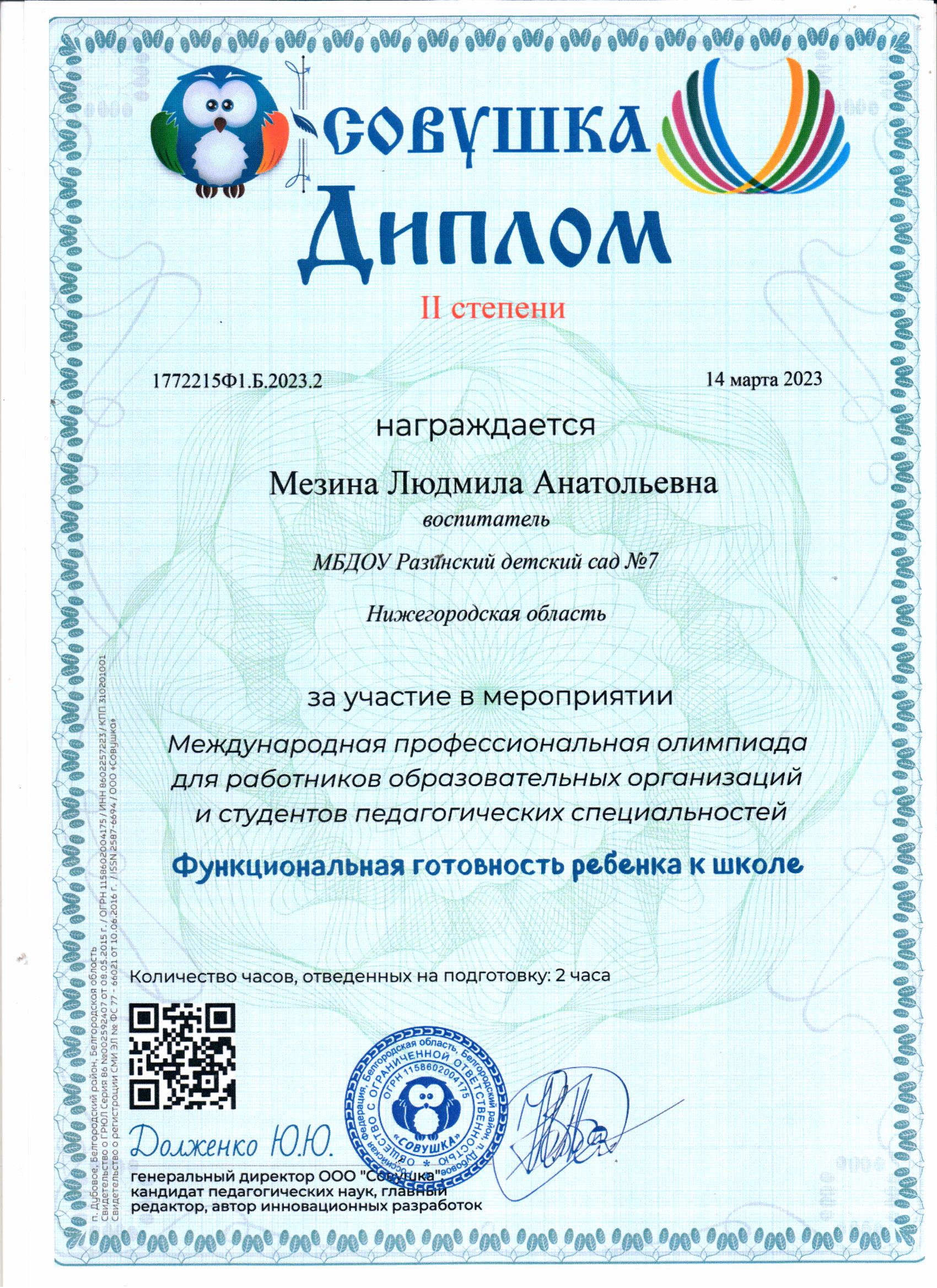 Диплом 2 степени за участие в мероприятии международная профессиональная олимпиада для работников образовательных организаций и студентов педагогических специальностей "Функциональная готовность ребенка к школе" Портал "СОВУШКА".